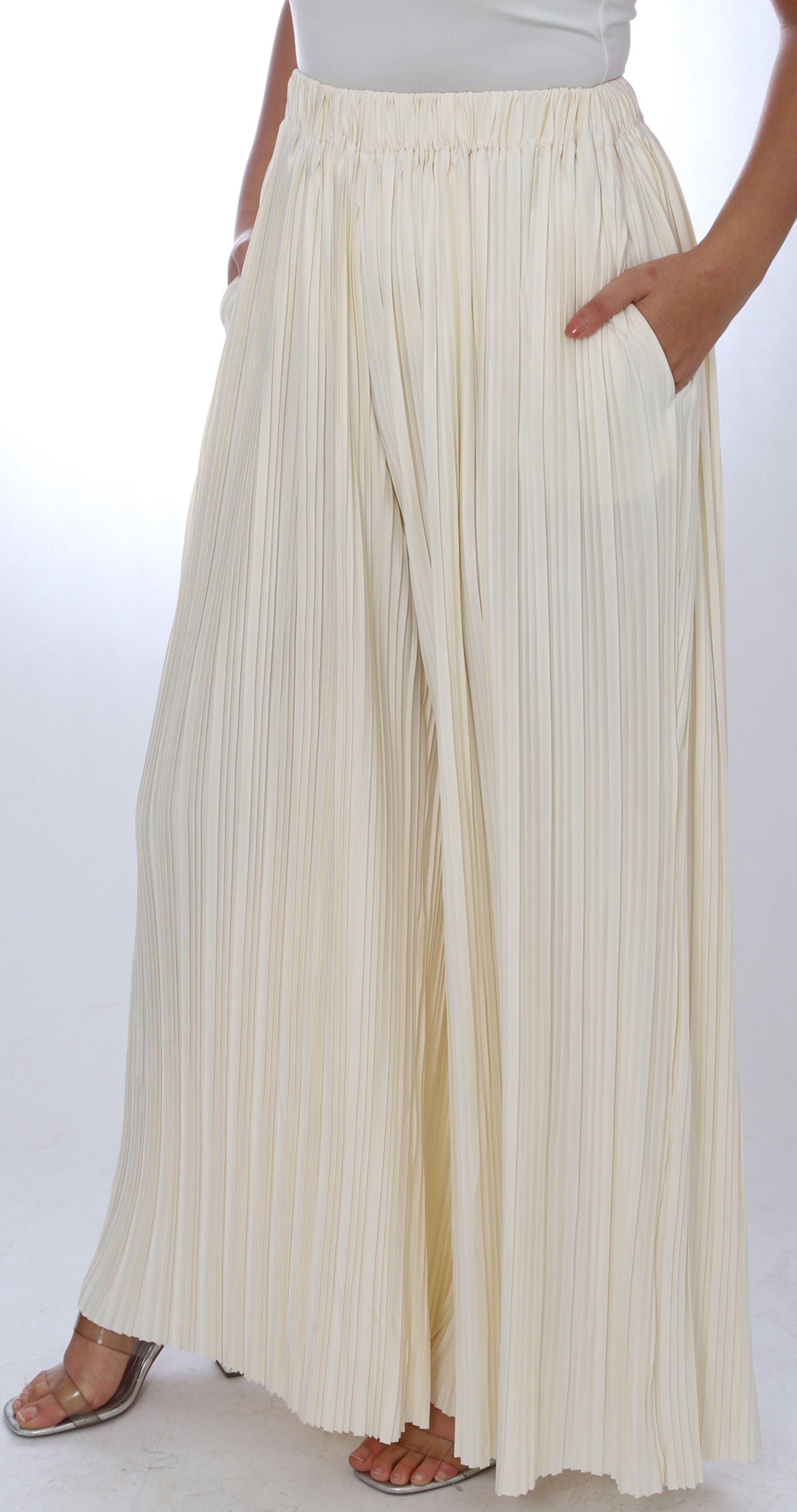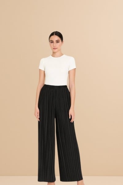 يتميز البنطلون بتصميم كسرات البيلسية التي تضيف حجماً وعرضاً للساقين، مما يمنحها حركة أكثر وأناقة في الحركة.