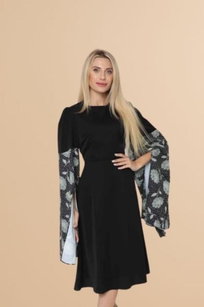 نعرض لك اليوم فستان أسود عصري متوسط الطول بأكمام جرس اللي يتميز بأناقته الساحرة وتصميمه الفريد اللي يجمع بين الكلاسيكية والعصرية.