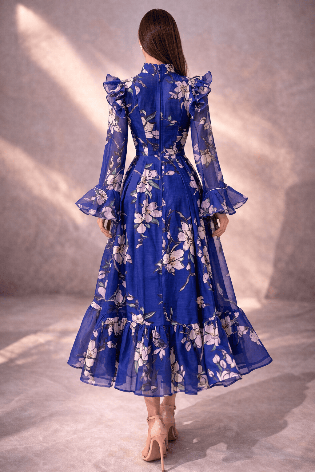 فستان مميز بطباعة زهور تجمع بين الرقي والنعومة، يأتي بلون أزرق جذاب مع قصّة واسعة تمنح حركة انسيابية مريحة. يتمتع بياقة عالية وأكمام طويلة تعزز من شكل الإطلالة الراقية. يصل طوله إلى الأرض ليمنح حضوراً أنثوياً وأنيقاً يناسب المناسبات النهارية والليلية الهادئة. تصميمه الكلاسيكي يجمع بين الأناقة والراحة