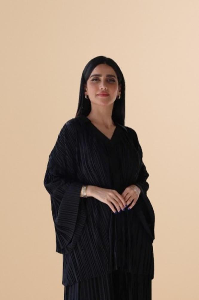 تتميز بلوزة لون اسود بأكمام للمناسبات بنعومتها بفضل الكسرات الواسعة (البليسية ).