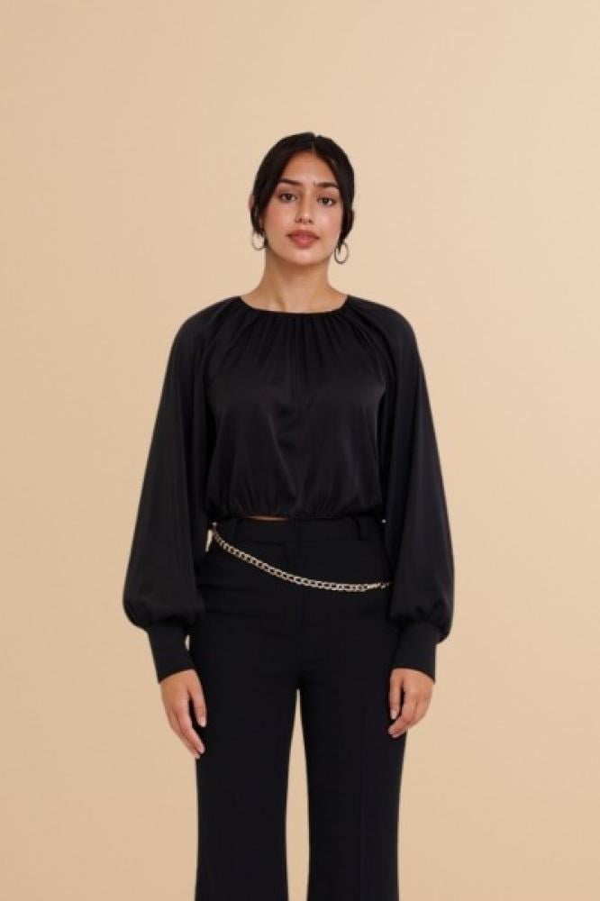 بنطلون أسود واسع يتميز بحركة سلاسل أنيقة عند منطقة الخصر، مما يضيف لمسة من الجرأة والفخامة على التصميم. قصته الواسعة توفر راحة وأناقة في آن واحد، بينما تفاصيل السلاسل تضفي لمسة عصرية وجذابة.