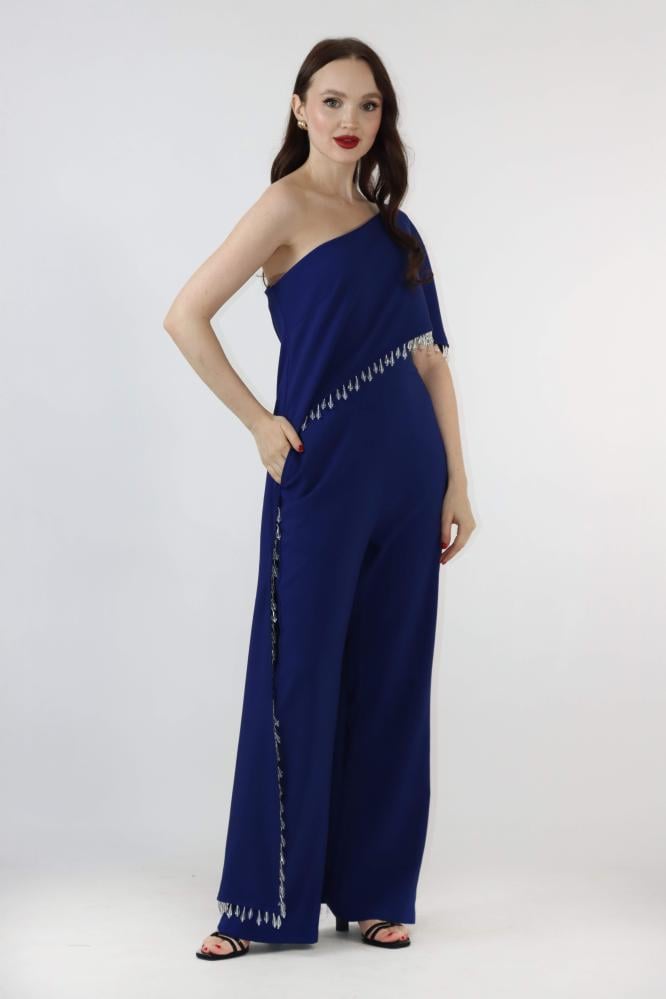جامبسوت أزرق بكتف واحد بتفاصيل فخمة