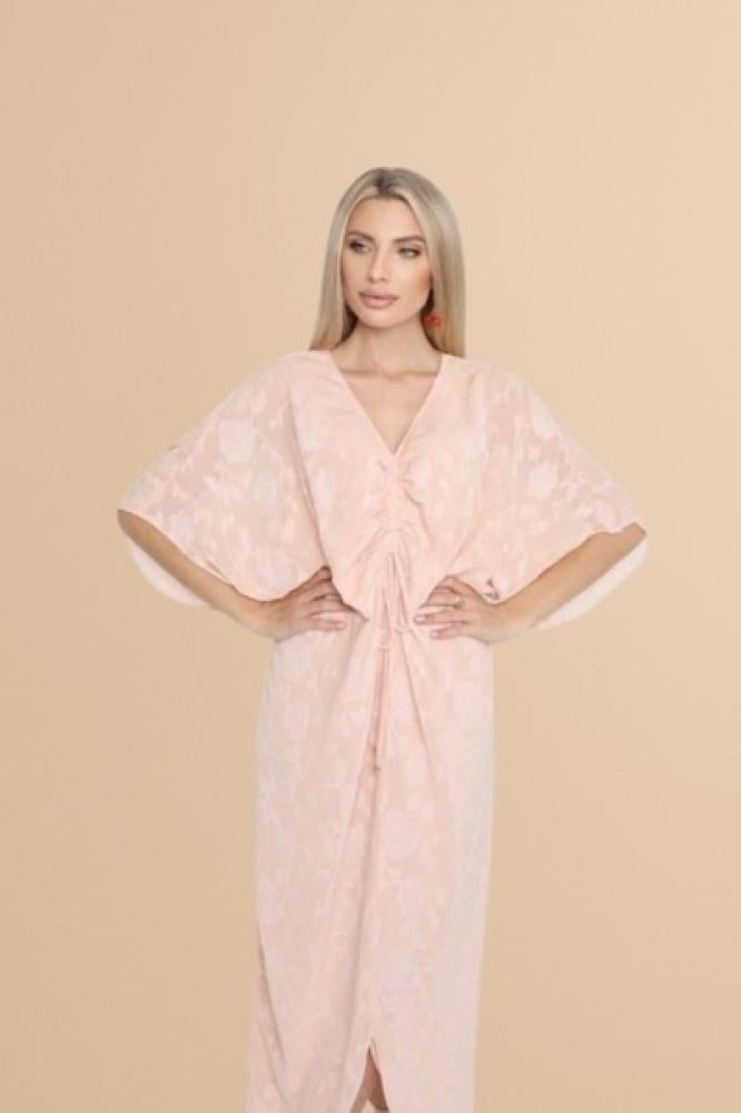تتميز هذه الجلابية بلونها الخوخي و أكمامها الواسعة اللي راح تضفي عليها طابعاً فريداً وجذاباً.
