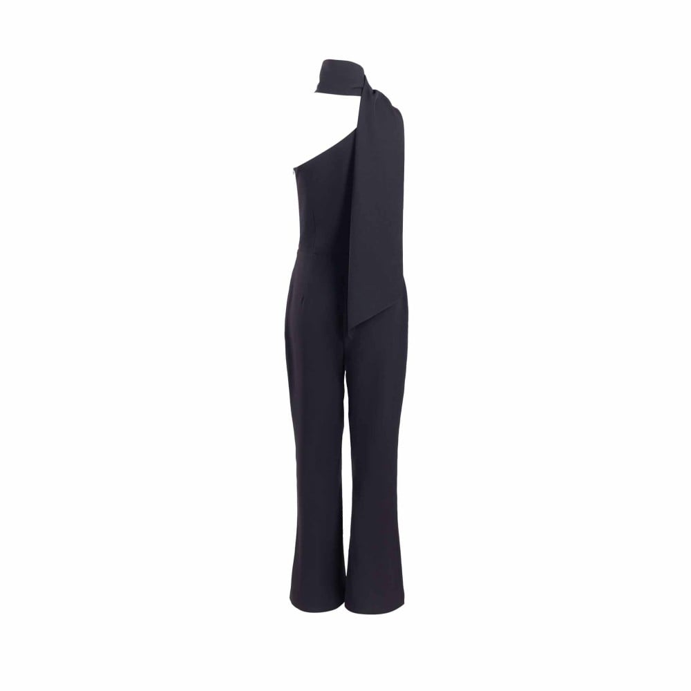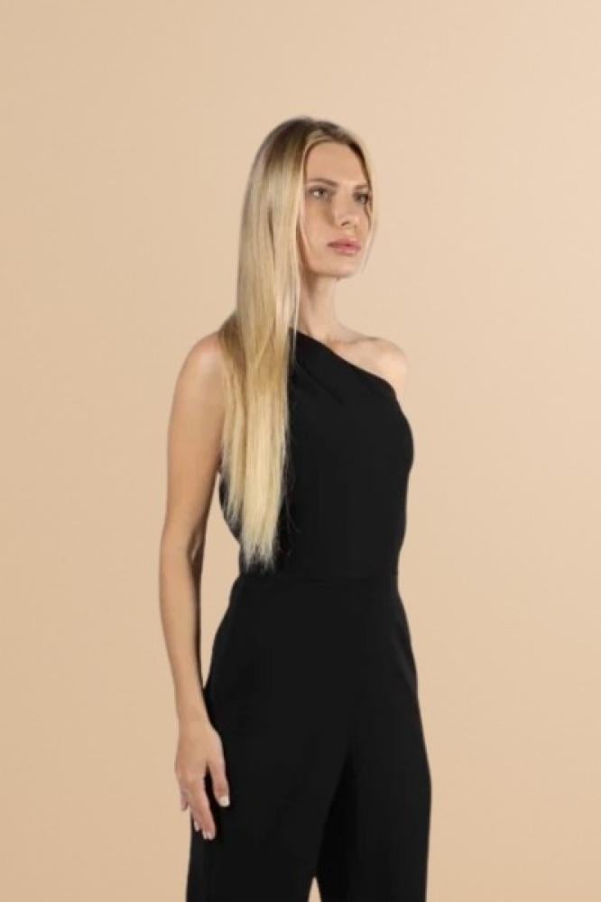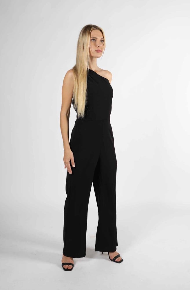 We present to you, Madam, a sexy black one-shoulder jumpsuit that combines classic elegance with a modern touch.